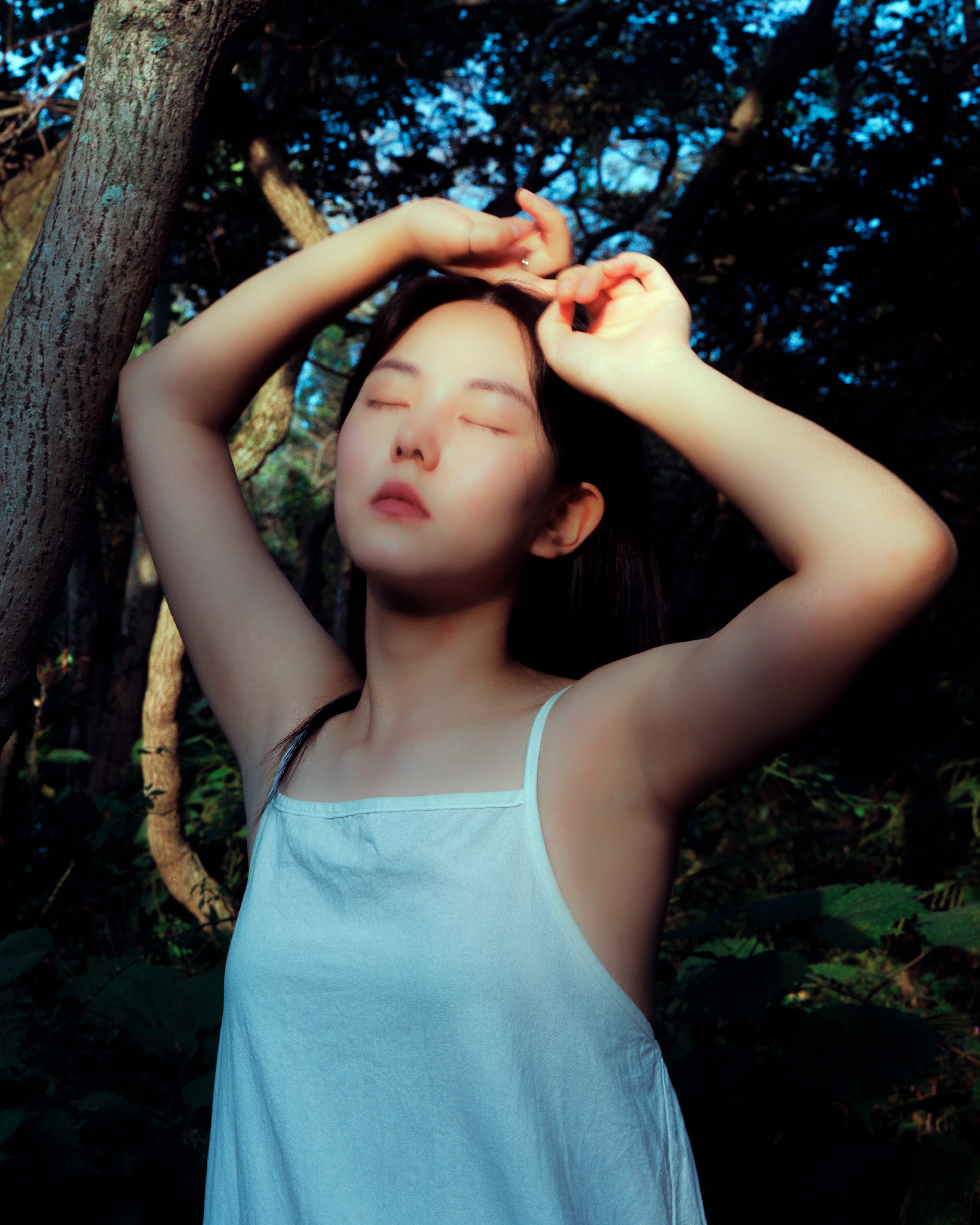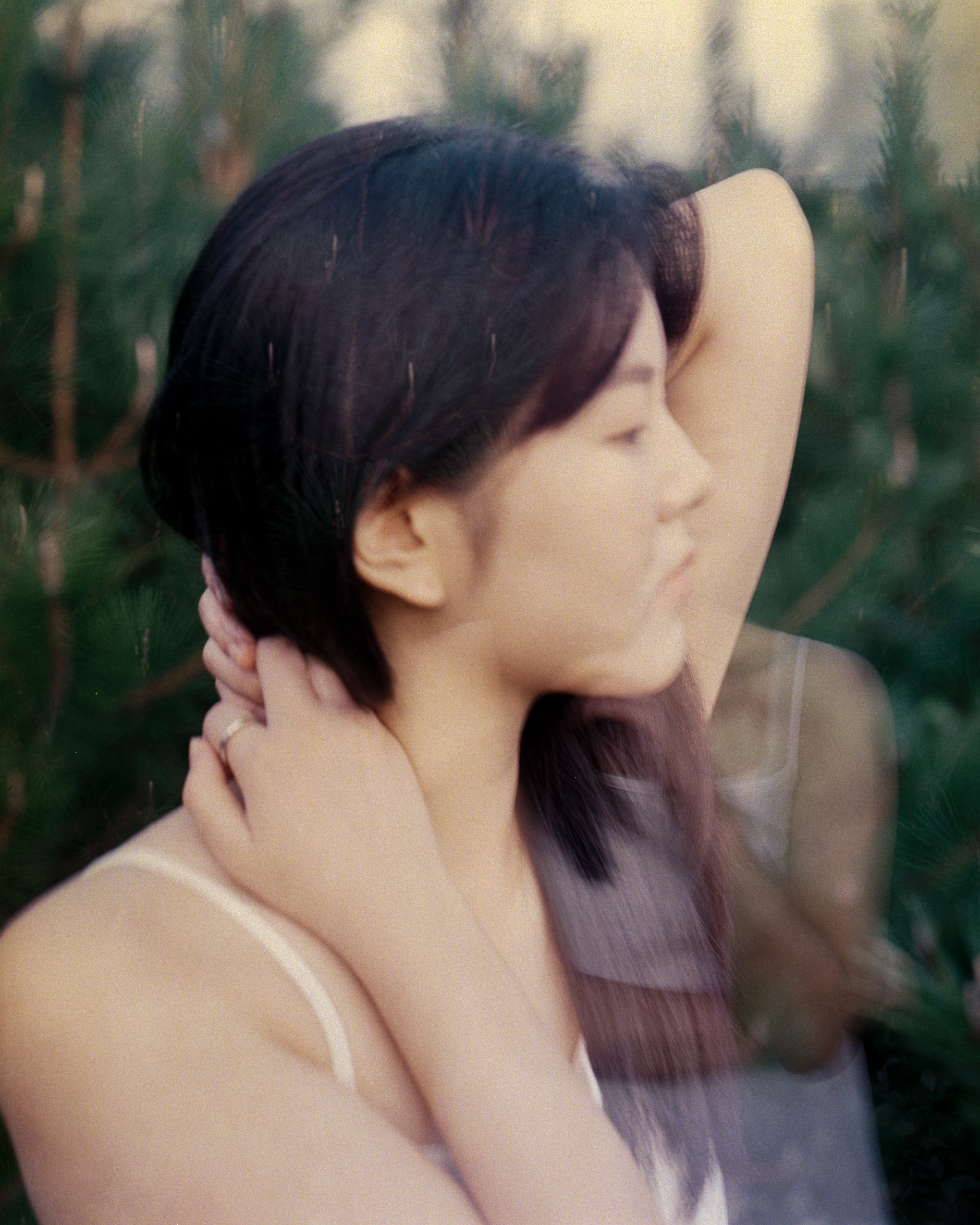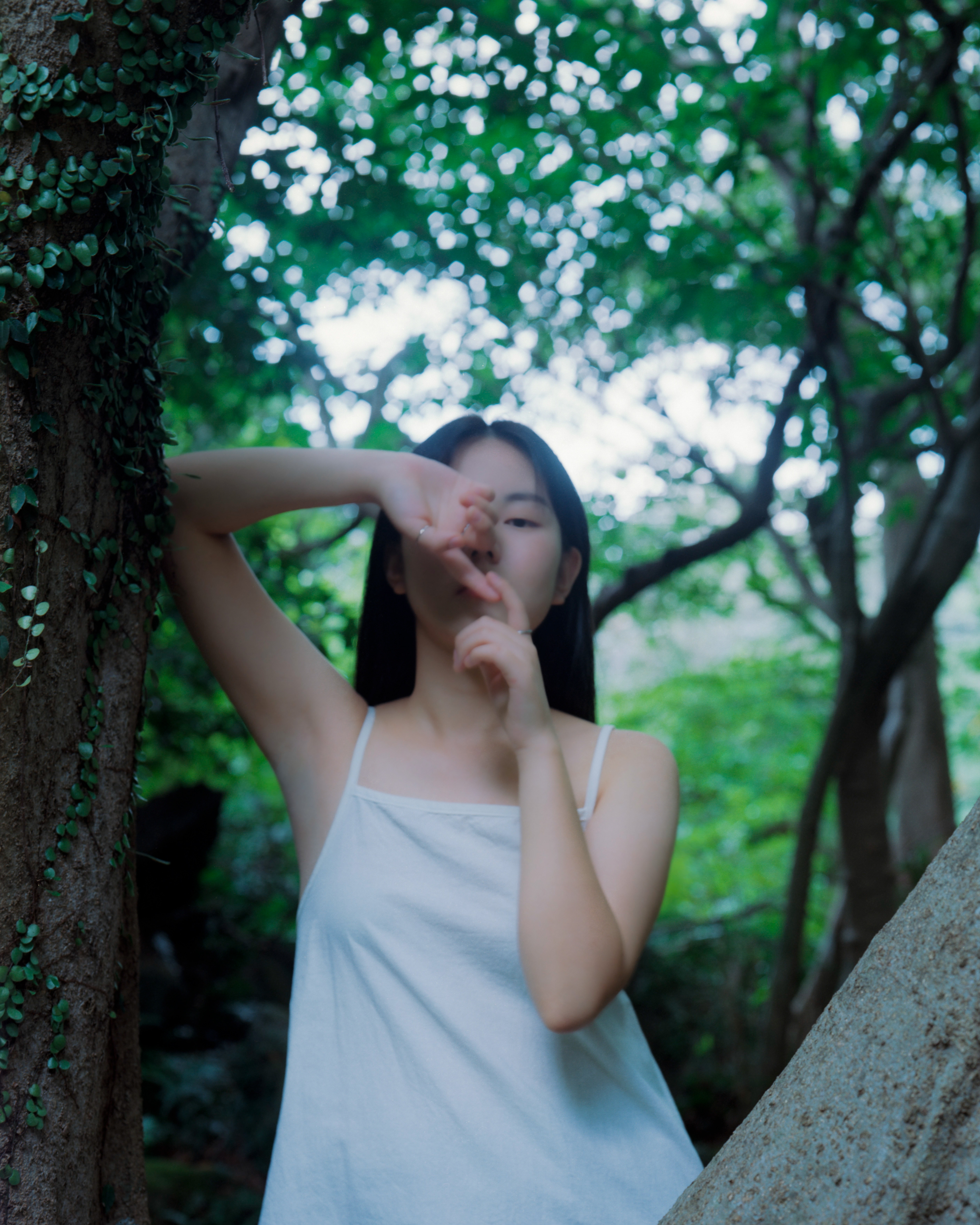 오한샘의 작업 〈환절기〉는 제주 곶자왈이라는 독특한 숲에서 태어났다. 곶자왈은 용암이 지나간 자리에 남은, 바위와 틈, 어둠과 식물들이 얽히고설킨 숲이다. 이 숲은 길들여지지 않았고, 쉽게 걸을 수 없으며, 감정처럼—한 번도 평탄하게 흐르지 않는다. 〈환절기〉는 이 숲의 리듬과 몸의 계절이 만나는 어느 한 시점에 대한 기록이다. 사계절의 전환 사이, 우리가 보통 지나쳐버리는 ‘감정의 틈’을 그는 천천히, 정면으로 응시한다. 사진 속 인물은 흐릿한 빛과 무거운 숲의 공기 안에 놓여 있다. 그들은 거의 움직이지 않고, 말하지 않고, 대신 얼굴을 가리거나, 고개를 돌리거나, 숲의 어둠 속에 잠긴다. 이 작업은 계절이 바뀌는 찰나에 존재하는 우울, 혹은 그 우울을 일부러 감각하려는 태도에 가깝다. 계절은 지나가지만, 감정은 그렇게 쉽게 움직이지 않는다. 우리는 때때로, 새로운 계절을 맞는 것이 아니라 이전 계절을 끝내 보내지 못하고 머문다. 〈환절기〉는 바로 그 머무름에 관한 이야기다. 죽은 계절을 밀어내는 것이 아니라, 그 잔여와 함께 있는 일. 무엇을 뒤로하고 넘어가야 할지 알 수 없는 시간에, 우리는 조용히 질문을 반복한다. 아주 한밤중에도 깨어 있고 싶었던, 그 감정의 마지막처럼.